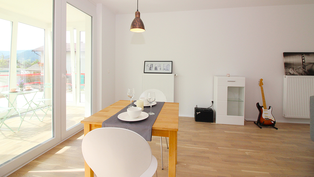 Iz vhodnega garderobnega dela lahko vstopite v nočni ali dnevni del stanovanja. V odprtem dnevnem delu je kuhinja, jedilnica in dnevna soba.