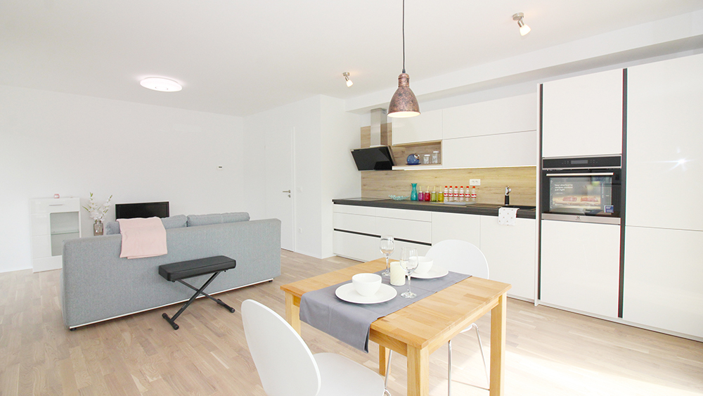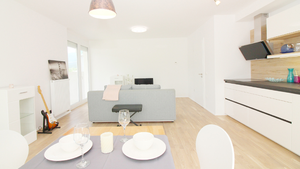 Iz vhodnega garderobnega dela lahko vstopite v nočni ali dnevni del stanovanja. V odprtem dnevnem delu je kuhinja, jedilnica in dnevna soba.